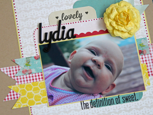 I used the red acrylic paint from the kit extras to make the little dots that go around the layout. The bottle is so easy to control and the paint dries really fast! The word "lovely" is from the Pink Paislee Photograms in the main kit and the leaves for the flower are cut from the Photograms packaging.